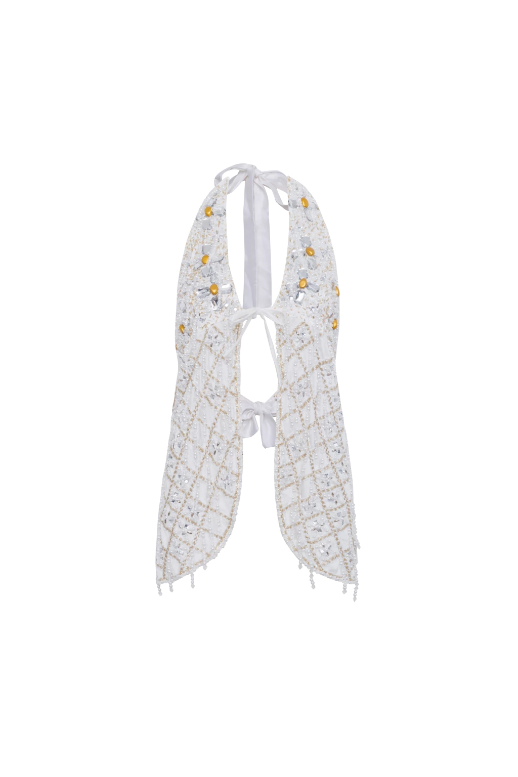 Embellished with a mix of stones and fringes that add sparkle and movement to the piece.