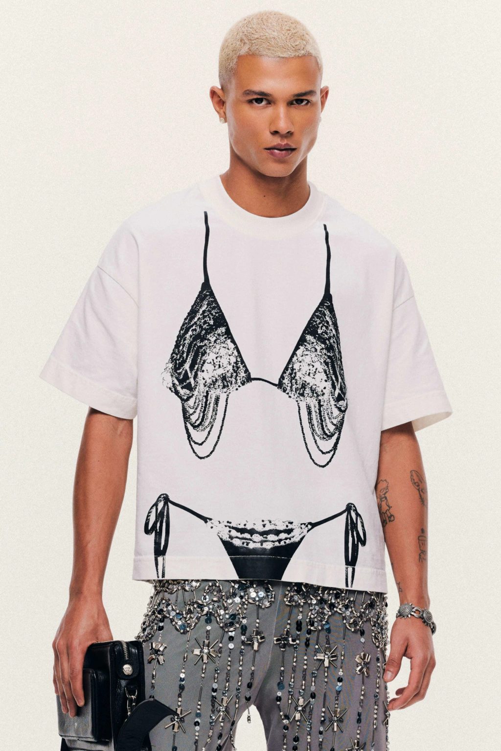Camiseta de modelagem boxer e gola canelada. Estampada à mão, desenho inspirado em peças icônicas HISHA, biquíni estro e estuário.