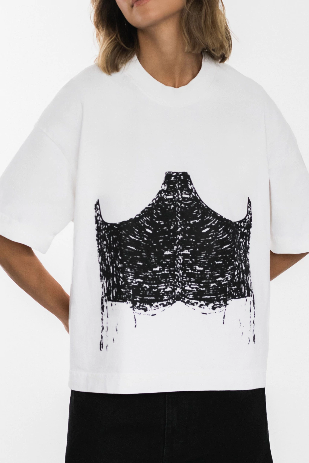 Camiseta de modelagem boxer e gola canelada. Estampada à mão, desenho inspirada em peça icônica HISHA, corset duma.