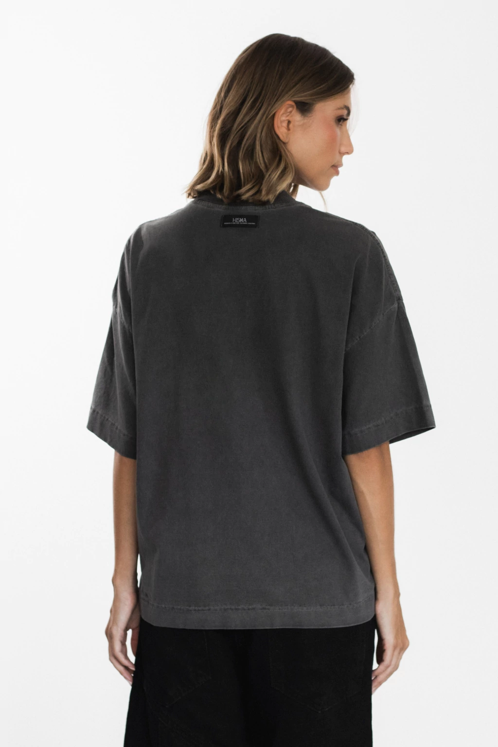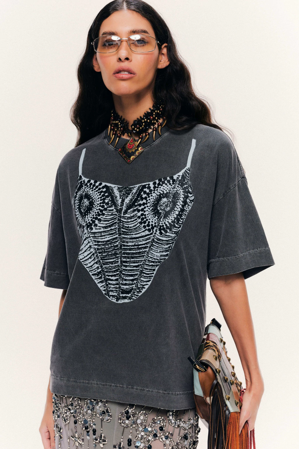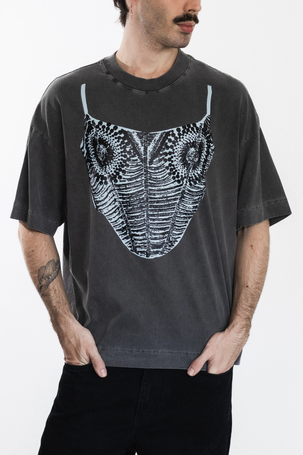 Boxer-style T-shirt, ribbed collar. Hand-printed with a design inspired by an iconic HISHA piece: the corset top.