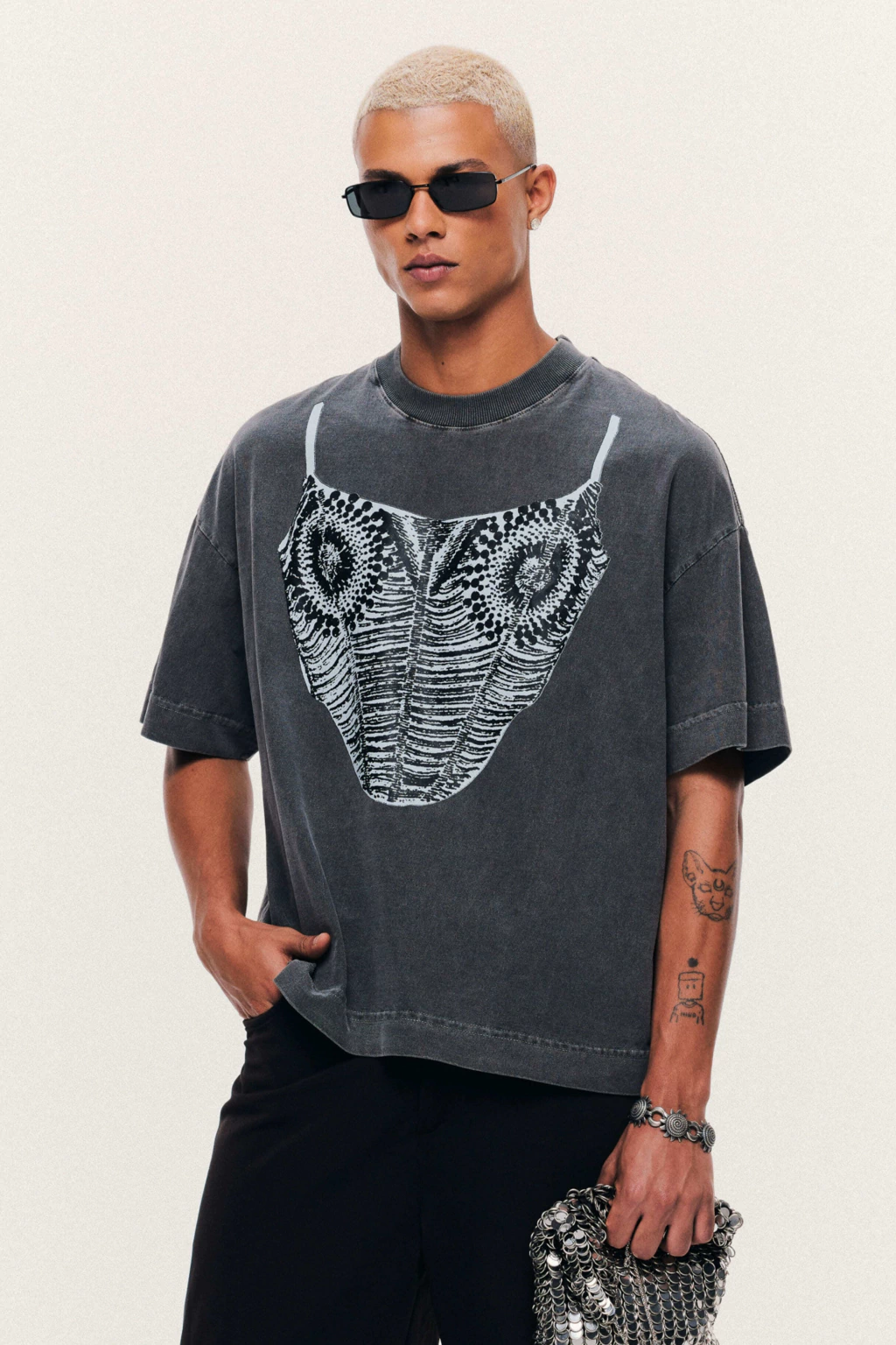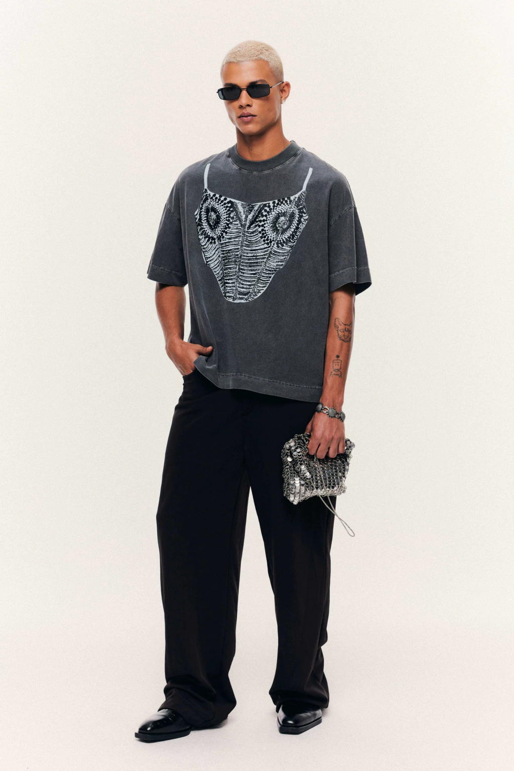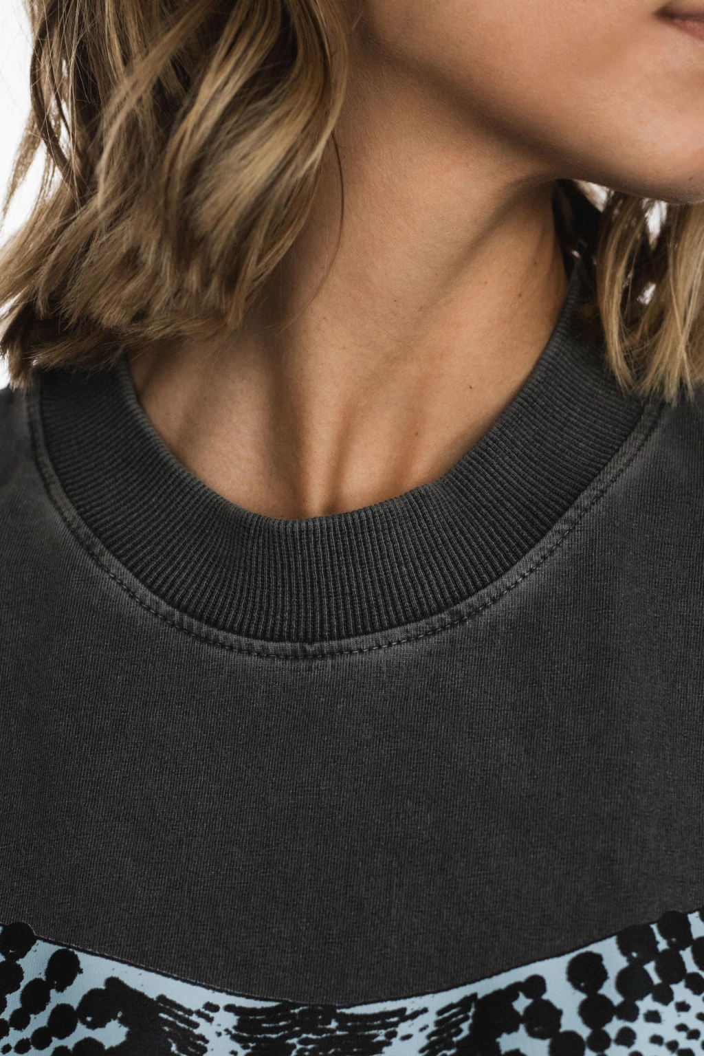 Boxer-style T-shirt, ribbed collar. Hand-printed with a design inspired by an iconic HISHA piece: the corset top.